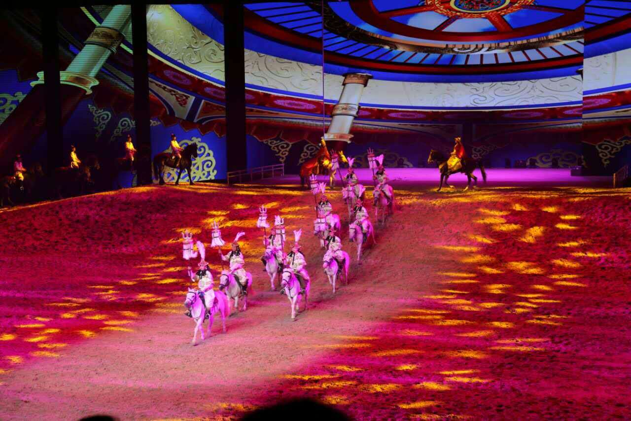 《千古馬頌》劇目演出以蒙古族歌、舞、樂、雜技等藝術(shù)元素,融合高科技聲光電及全息影像投影技術(shù),以全新藝術(shù)形式演繹了馬背家園的溫情,百駿出征的壯觀,草原兒女的情愫,千古馬頌的絕唱!將人與馬的情緣演繹的淋漓盡致,唯美震撼……我公司在此次演出項(xiàng)目上采用Barco6臺(tái)2K40通過拼接及融合的技術(shù)實(shí)現(xiàn)了非常壯觀的視覺盛宴。
